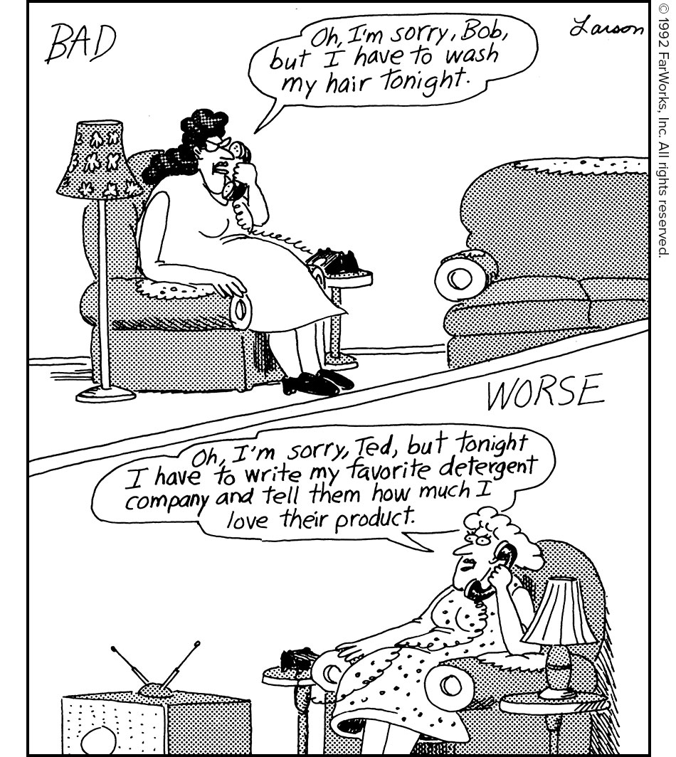 BAD / Oh, I’m sorry, Bob, but I have to wash my hair tonight. / WORSE / Oh, I’m sorry, Ted, but tonight I have to write to my favorite detergent company and tell them how much I like their product.